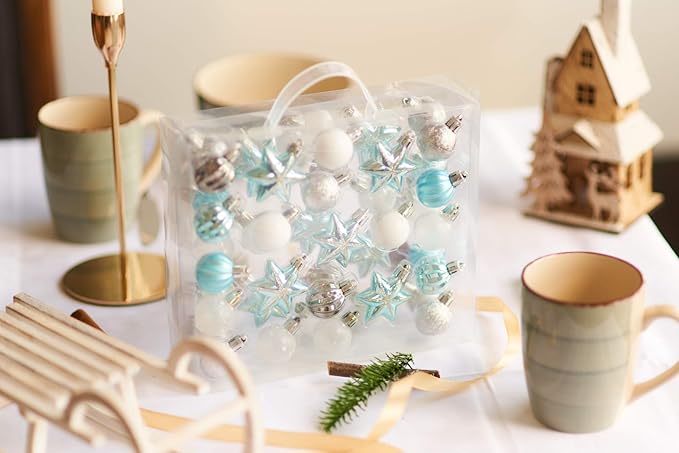 De decoraties zijn licht van gewicht, waardoor ze eenvoudig te verwerken zijn zonder takken of linten te belasten. Dankzij de variatie in afwerking, zoals matte, glanzende of subtiel glitterende elementen, geven deze kleine ornamenten extra diepte en sfeer. De set is ideaal voor wie graag creatief bezig is, maar ook voor wie simpelweg een elegante aanvulling zoekt op bestaande decoraties. Deze 44-delige set zorgt ervoor dat je voldoende ornamenten hebt om meerdere ruimtes of projecten op een harmonieuze en feestelijke manier aan te kleden.