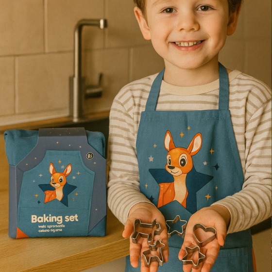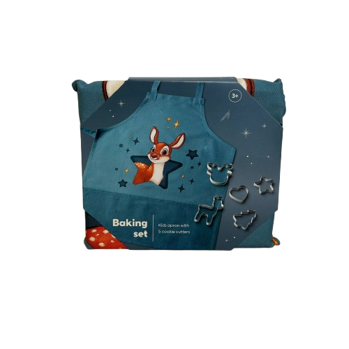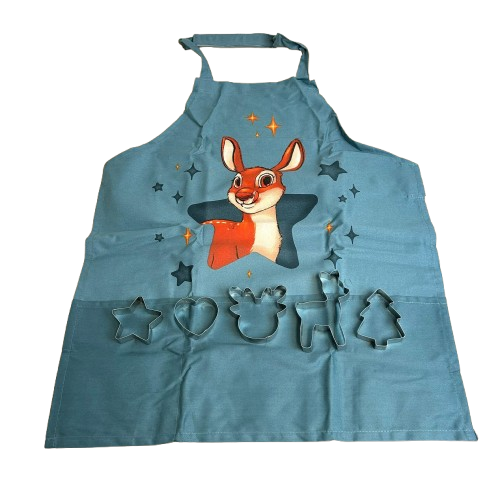 Met dit charmante Hert Bakset wordt bakken een feest voor jong en oud. Het setje bestaat uit een vrolijk blauw keukenschort met een schattige hertopdruk, perfect voor de feestdagen of gezellige bakmomenten thuis. Het schort is gemaakt van stevig katoen en biedt goede bescherming tegen meel, deeg en andere bakspetters.