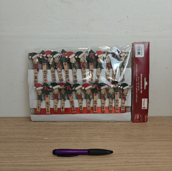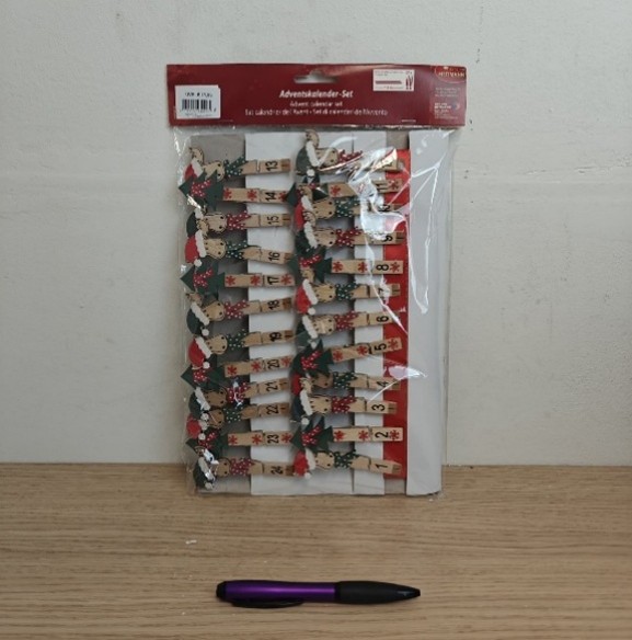 De knijpers zijn voorzien van duidelijke nummering, waardoor het tellen naar Kerst overzichtelijk en leuk wordt voor zowel kinderen als volwassenen. Door het stevige ontwerp blijven ook iets zwaardere items goed hangen. De set is vooraf geprijsd, wat vooral handig is voor winkels of bedrijven die deze adventskalender willen opnemen in hun assortiment. De Adventskalender biedt een creatieve en persoonlijke invulling aan de kerstperiode. Je kunt de clips vullen met kleine geschenken zoals snoepjes, briefjes, activiteiten, speelgoed of inspirerende quotes.