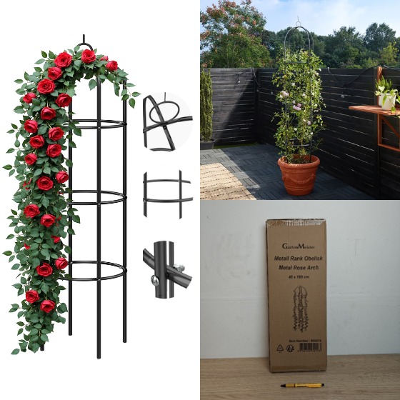 De rozenboog is gemaakt van stevig metaal met een weerbestendige coating, waardoor hij bestand is tegen regen, zon en wind. Dit garandeert een lange levensduur en minimale onderhoudsbehoefte. De stabiele constructie zorgt ervoor dat de boog stevig in de grond verankerd blijft, zelfs wanneer de planten volgroeid zijn.